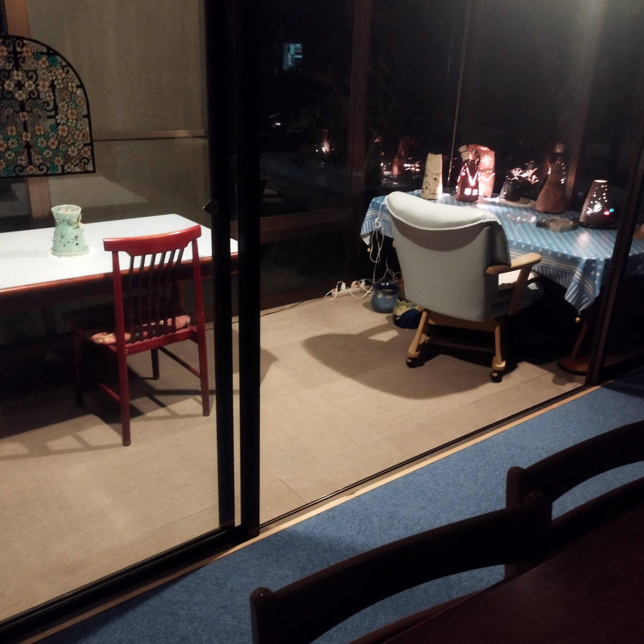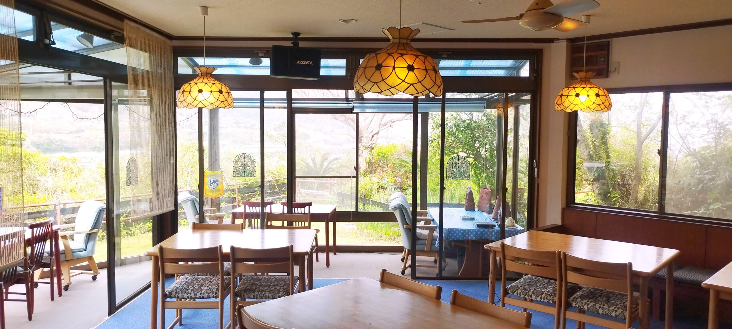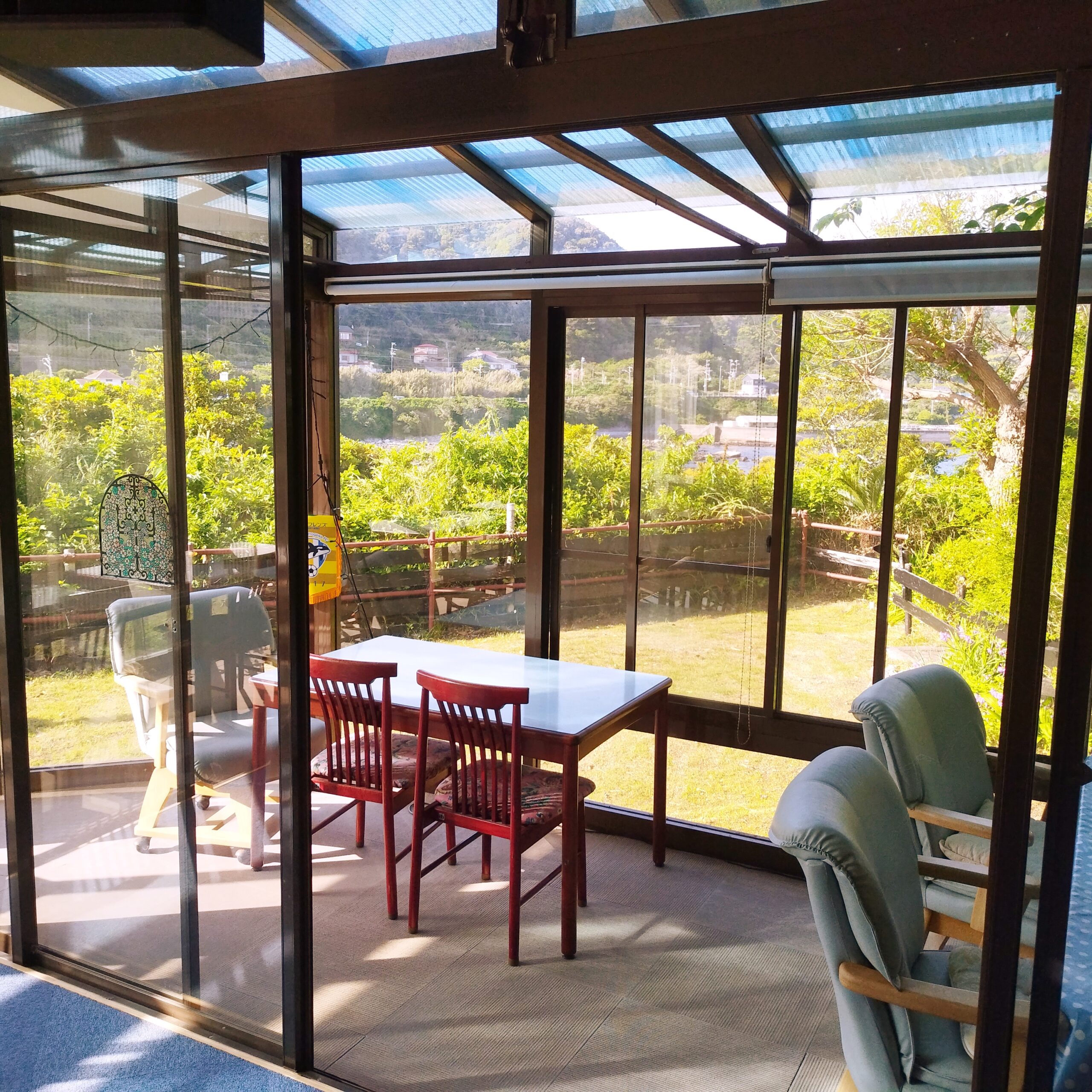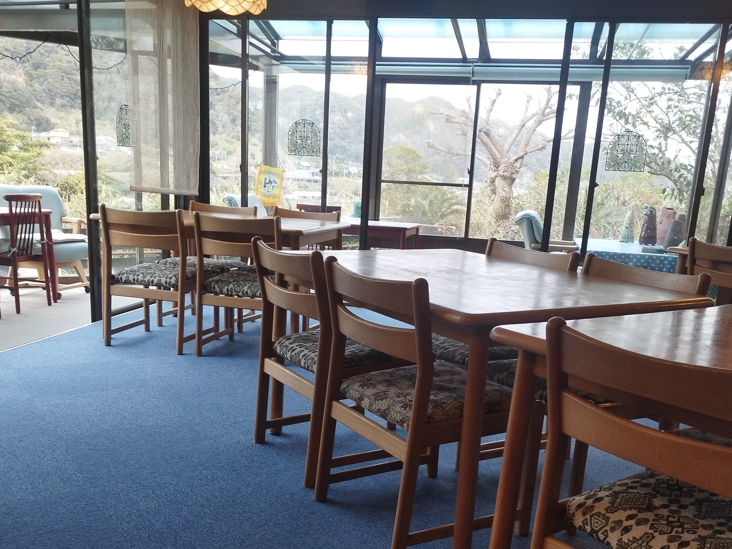 ご自由にくつろいでいただけるパブリックスペース、食堂。テラス席からも太平洋が望めます。持ち込みいただいたお食事も当館食堂でご利用可能です。エアコンが効いた食堂でおくつろぎください。